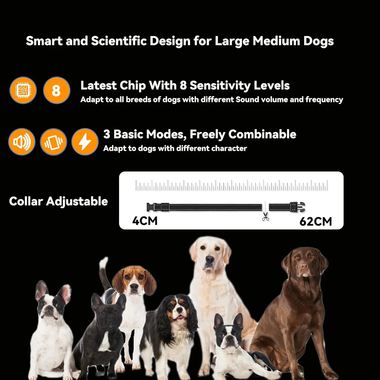 - Technologie intelligente de détection des aboiements et sensibilité réglable 8 : Le capteur de déclenchement particulier détectera les chiens qui aboient plus précisément et plus rapidement, ce qui peut filtrer en toute sécurité et efficacement d’autres sons sans rapport et empêcher les faux déclenchements. L’ajustement de la sensibilité dans différents environnements peut protéger efficacement le chien contre les punitions inutiles et l’entraîner plus efficacement. Le niveau 8 est le plus sensible, et le niveau 1 le moins sensible.