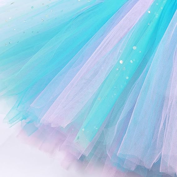 Apparence de rêve : Le haut est décoré d'éléments marins et de fleurs, tandis que la jupe est composée d'un mélange de tulles de différentes couleurs. De plus, la conception avec des paillettes fait briller la robe sous la lumière du soleil, lui donnant un aspect magnifique et magique.