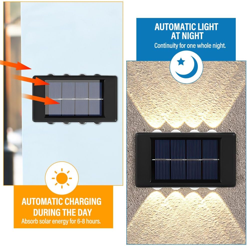 - 💡【8 appliques murales d'extérieur à LED】Chaque Lampe Solaire Exterieur dispose de 4 lumières LED en haut et en bas, elle peut produire une lumière uniforme, lumineuse et douce, ajoutant une atmosphère relaxante et chaleureuse à votre maison ou votre jardin. Il peut également très bien répondre à vos besoins quotidiens.
