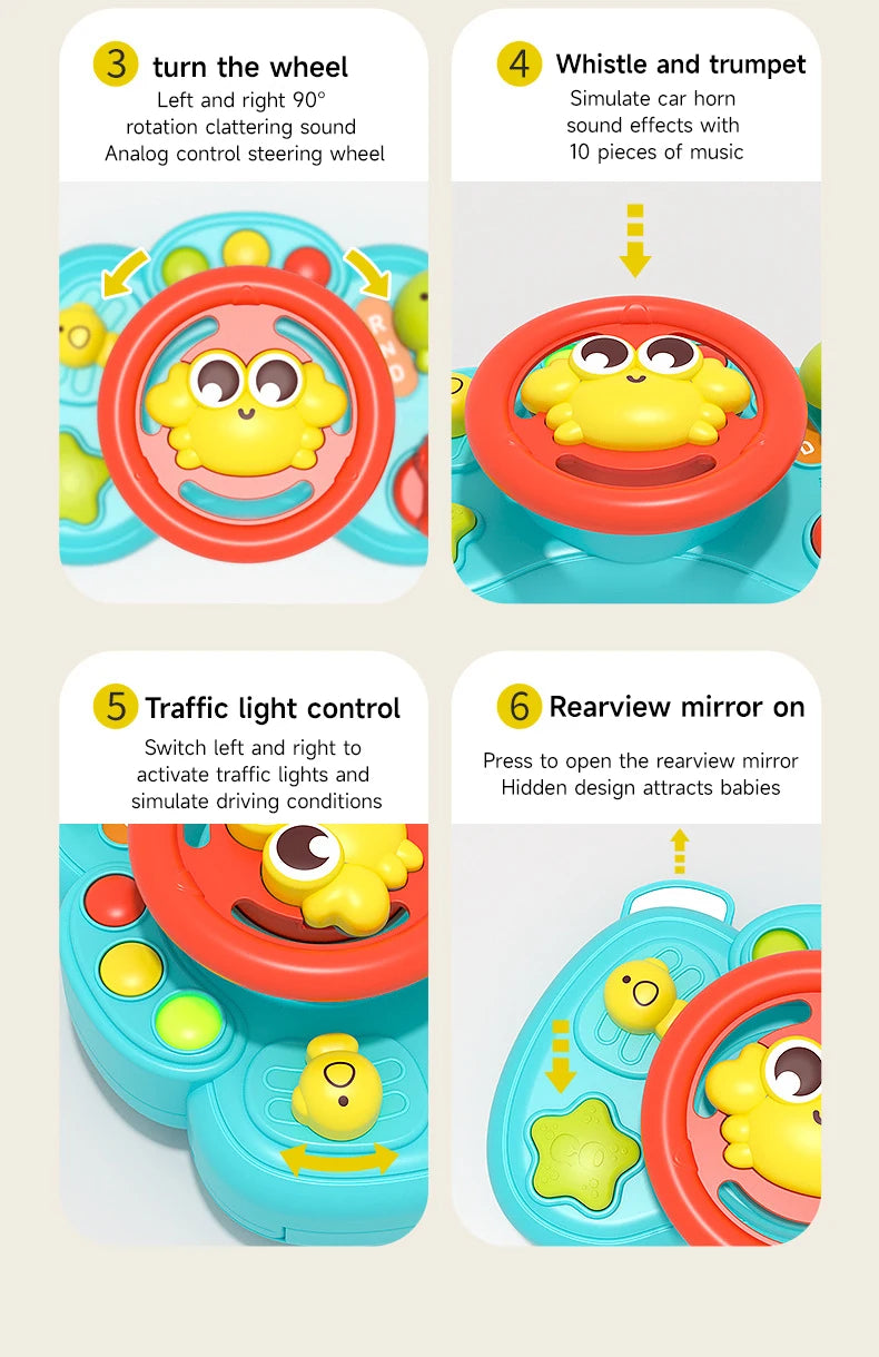 Ce jouet sur le volant pour tout-petits apportera plus de joie aux enfants avec ses caractéristiques réalistes et amusantes. Il a de nombreux types de musique qui peuvent être joués en appuyant sur la touche musique et arrêtés en appuyant à nouveau.