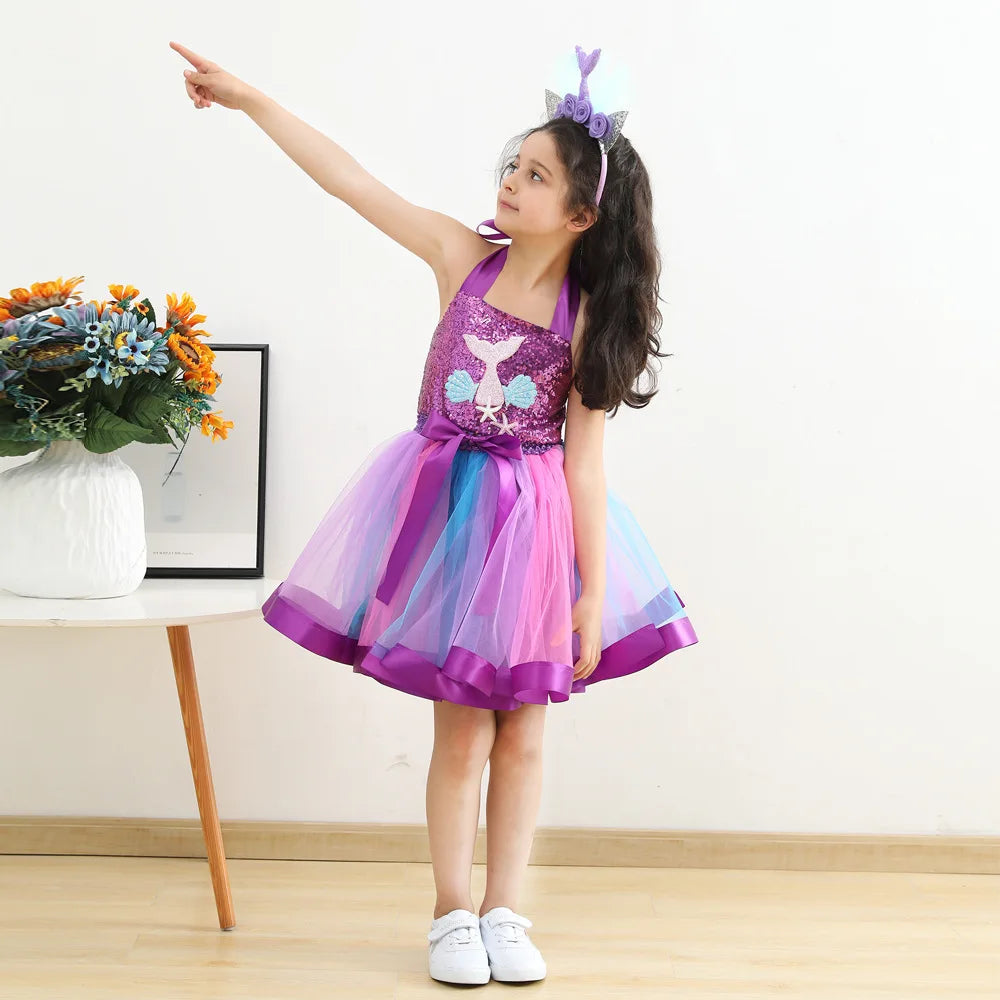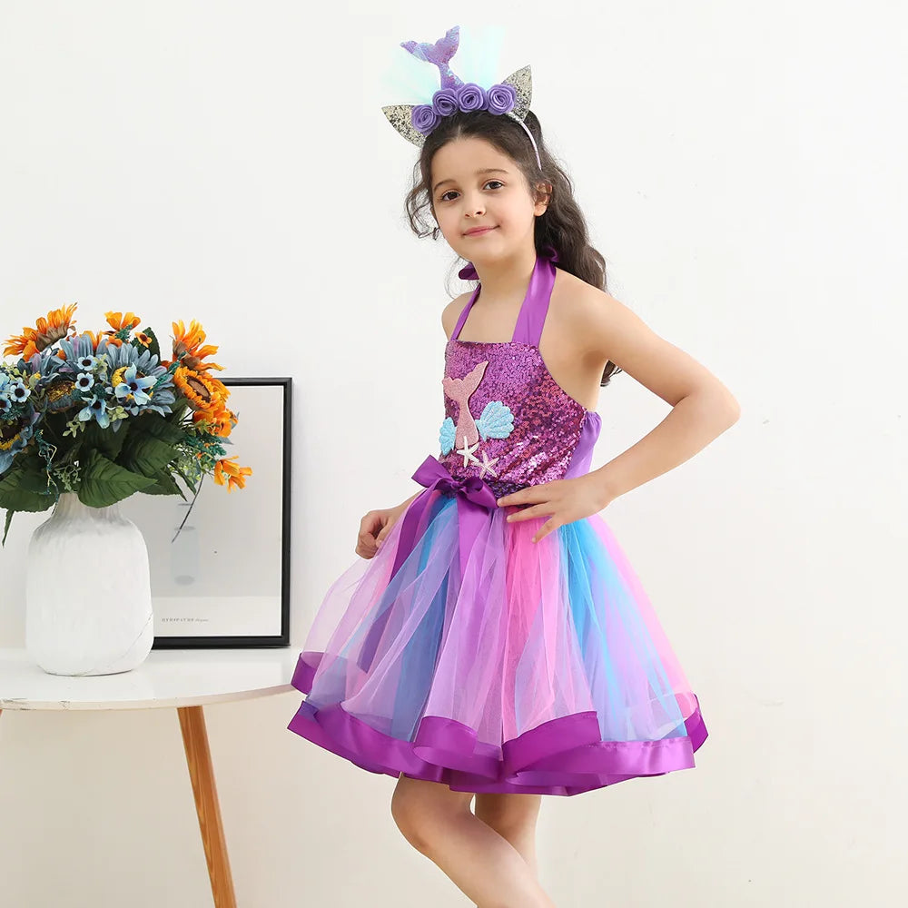 Enfant filles robe de sirène princesse bretelles en ruban réglable Épaule peuvent être nouées avec un nœud papillon dans le dos. Corsage élastique en crochet sur le devant orné d'une queue de sirène, d'une applique de pétoncles et d'étoiles de mer