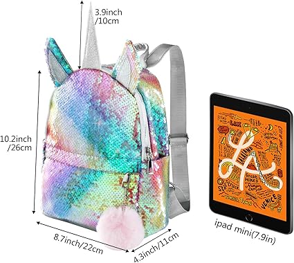 - 【1】 Dimensions pour le sac à dos Licorne: 8,7 x 4,3 x 10,2 iches (22 * 11 * 26cm), taille parfaite pour l'école ou les voyages et la vie quotidienne.