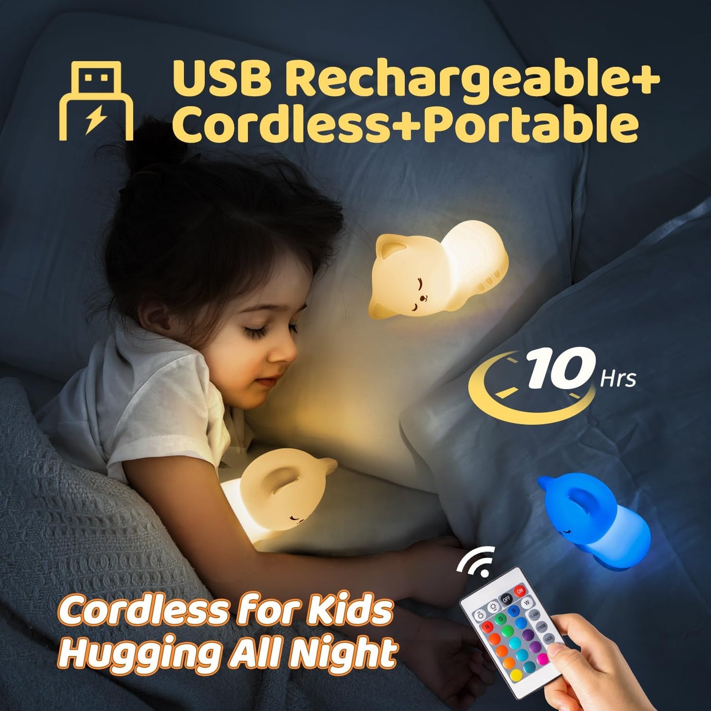 - ❤VEILLEUSE BÉBÉ 16 CHANGEMENTS DE COULEURS+TÉLÉCOMMANDE +TAP CONTROL: La veilleuse enfant rechargeable a 16 jolies couleurs, les enfants peuvent s'amuser à changer de couleur.Il suffit d'appuyer sur la veilleuse enfant & veilleuse bébé pour allumer/éteindre la veilleuse bébé et passer en mode changement de couleurs. La veilleuse enfant émet des lumières douces et légères.En tapotant, la veilleuse bébé & veilleuse enfant procure beaucoup de plaisir aux enfants ! La lampe de chevet enfant & veilleuse bebe fait aussi un decoration chambre bebe! Les enfants adorent la veilleuse bébé pour s'amuser en tapotant & comme decoration chambre bebe! La veilleuse chat est l'amie des enfants!VEILLEUSE ENFANT RECHARGEABLE PAR USB & BATTERIE INTÉGRÉE & SANS FIL: La veilleuse bebe est équipée d'une batterie au lithium intégrée de 1200mAh, c'est une veilleuse enfant rechargeable par USB. Une fois chargée, la lampe de chevet enfant & veilleuse bebe peut fonctionner pendant environ 10 HEURES, la veilleuse enfant peut s'occuper de bébé pendant toute la nuit.La veilleuse enfant rechargeable est PORTABLE & SANS FIL,les enfants peuvent la tenir comme compagnon de sommeil. Une veilleuse chat parfaite pour la decoration chambre bebe & lampe de chevet chambre bebe.La veilleuse chat & veilleuse bebe & veilleuse LED & lampe de chevet chambre bebe est une sucette pour le sommeil des enfants! VEILLEUSE BÉBÉ EN SILICONE 100% SÛRE & DOUCE POUR QUE LES ENFANTS DORMENT MIEUX: La veilleuse enfant & veilleuse bebe est fabriquée en silicone qui est SUPER DOUX comme un gâteau et strictement testé pour la sécurité. Bébé peut même baver sur cette veilleuse bebe en silicone. Les enfants peuvent aussi tapoter et pincer la veilleuse chat kawaii chambre bebe, le silicone est si doux que les enfants peuvent s'amuser à jouer avec. La veilleuse enfant & lampe de chevet chambre bebe offre un sens apaisant, ce qui permet à bébé de s'endormir, une veilleuse bebe parfaite pour les enfants à l'heure du coucher! La veilleuse bébé est SUPER DOUCE et sûre, bébé peut la tenir toute la nuit! APPUYEZ SUR LA COMMANDE POUR ALLUMER/ÉTEINDRE & POUR CHANGER DE COULEUR: Les enfants peuvent appuyer sur la veilleuse bebe pour l'allumer ou l'éteindre, c'est si amusant et si agréable pour les enfants ! Le bébé peut également appuyer sur la veilleuse bebe & lampe de chevet enfant pour changer la couleur de la lumière. Les enfants peuvent jouer avec la veilleuse bébé avec beaucoup de plaisir & joie ! Le matériau en silicone est si doux et sûr que les enfants peuvent le presser et le tapoter, tout en profitant de ses couleurs arc-en-ciel. La veilleuse bébé & veilleuse rechargeable & veilleuse LED n'est pas seulement une veilleuse, c'est aussi un compagnon de jeu pour les enfants!LE CADEAU LE PLUS KAWAII POUR LES ENFANTS & BÉBÉS: La veilleuse enfant est veilleuse chat kawaii deco chambre, les enfants tapent dessus & apprécient le changement de couleur, la veilleuse chat est donc un cadeau idéal pour lenfants & bébés! La veilleuse bébé & veilleuse rechargeable fait un decoration chambre bebe & kawaii deco chambre bebe. La veilleuse bébé & veilleuse rechargeable est amusante & jolie, les enfants adorent jolie veilleuse chat en cadeau! La veilleuse bébé & veilleuse enfant est un cadeau idéal pour les enfants & bébés. Votre petite fille admirera la veilleuse chat kawaii deco chambre bebe & dira: "Merci maman, maintenant je peux dormir avec mon copain chat ce soir!"SANS FIL & PORTABLE POUR LES ENFANTS QUI TENENT TOUTE LA NUIT: La veilleuse enfant & veilleuse bébé est veilleuse rechargeable par USB. Une fois chargée, la veilleuse bebe veilleuse LED peut fonctionner pendant environ 10 heures, la veilleuse enfant & veilleuse bebe peut s'occuper de bébé pendant toute la nuit. La veilleuse bebe & veilleuse enfant & veilleuse rechargeable est PORTABLE & SANS FIL, les enfants peuvent la tenir comme compagnon de sommeil ! Les enfants peuvent aussi la tenir pour faire leur toilette. Une veilleuse chat parfaite pour la lampe de chevet chambre & kawaii deco chambre bebe! La veilleuse chat est un compagnon idéal pour le sommeil des enfants!